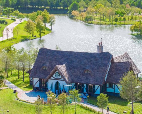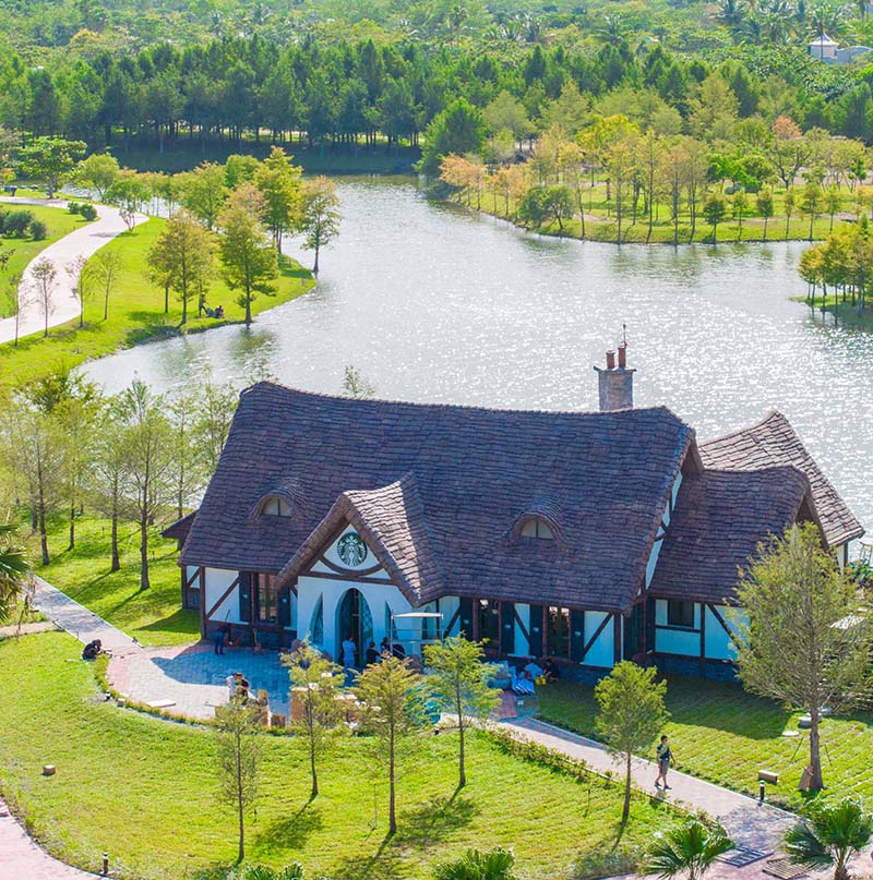 理想大地星巴克這裡不是城市街角的咖啡店,而是一座 被湖水、拱橋、紅瓦屋頂與綠意包圍的歐式小鎮咖啡館。